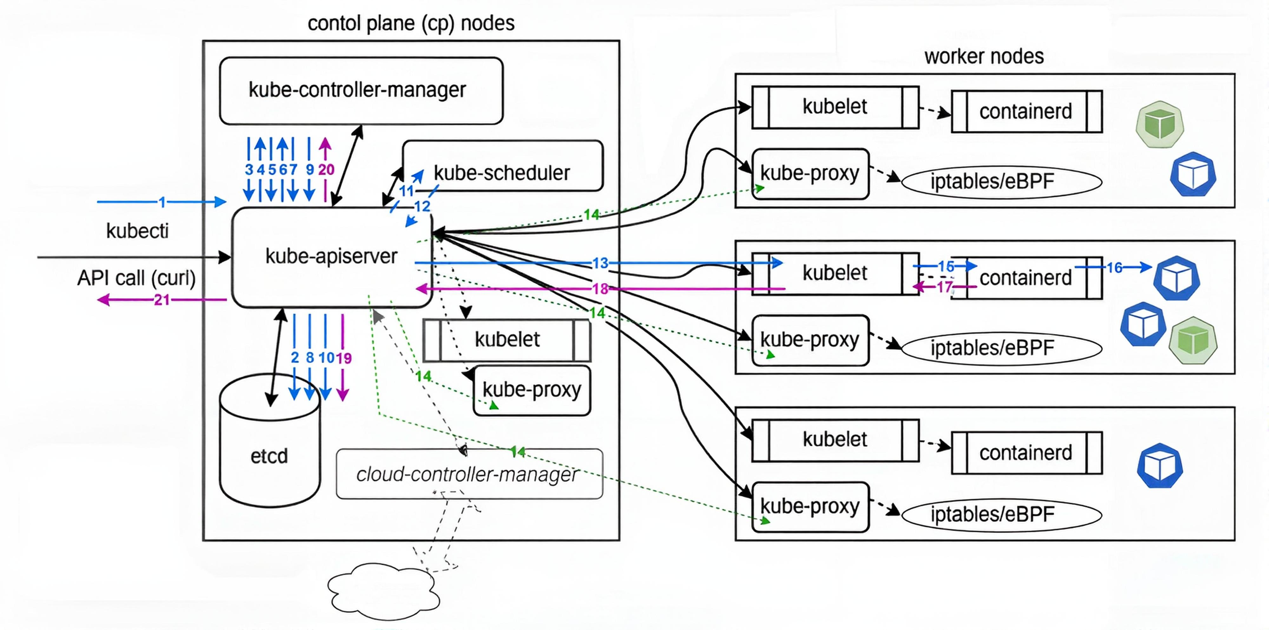 14: Networking configuration updates are sent to each kube-proxy, ensuring awareness of the new setup, often using ipvs or eBPF with plugins like Cilium.